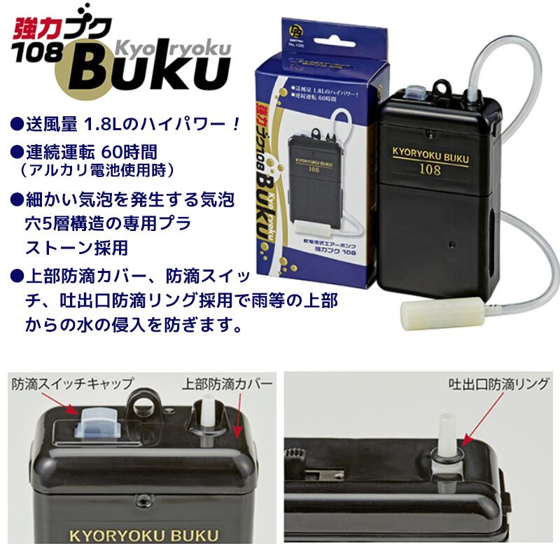 エアーポンプ 強力ブク 108 送風量1.8L 連続運転60時間 単一電池2個使用 ダイトウブク 釣り フィッシング