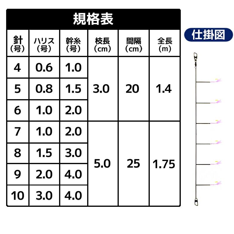 10号:針10号/ハリス3.0号/幹糸4.0号/枝長5.0cm/間隔25cm/全長1.75m