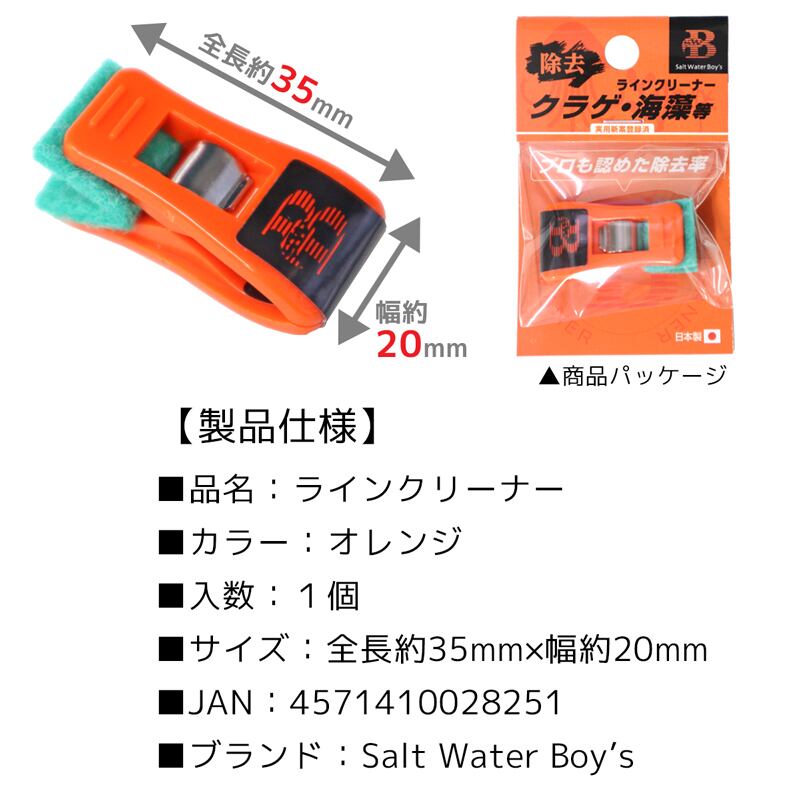 ■品名:ラインクリーナー ■カラー:オレンジ ■入数:1個 ■サイズ:全長約35mm×幅約20mm ■JAN:4571410028251 ■ブランド:Salt Water Boy’s
