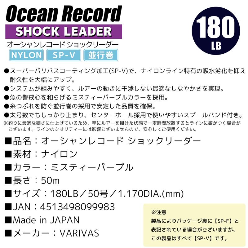 オーシャンレコードショックリーダー 50m 180LB/50号 ナイロン SP-V 平行巻 VARIVAS