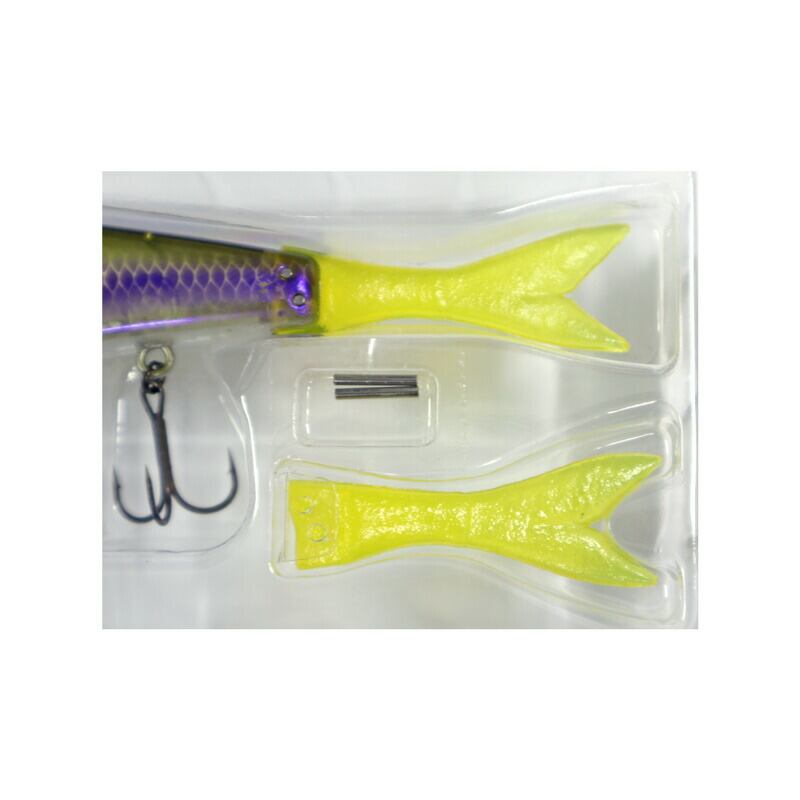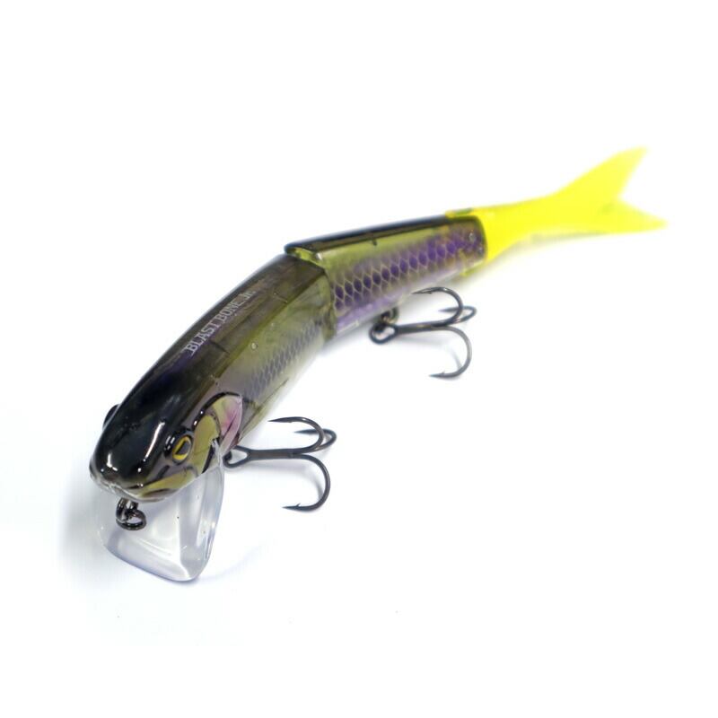 カバー際で本領を発揮する“ブラストボーン”は、ルアーが狙いたいスポット(カバー際、シェード等)から離れすぎてしまうと食われない魚に対し、じっくりとアピールできるジョイントベイトです。クイックに折れ曲がる「シングルジョイントボディ」と、前進する力にブレーキをかける「幅広フリップ」で最小限の移動距離でドッグウォークが可能です。また、ボディアクションに遅れて追従するソフトマテリアルテールは、アクションに“艶めかしさ”をブラスし、食わせの要素となりバイト率を向上させます。さらに、ストレートリトリーブでは、ワンジョイントの特徴である後方ボディーをツイストしながら、扁平ボディーをフラッシュロールさせ、アピール力の強いアクションを起こします。水面直下のエキサイティングなゲームをご体感ください。