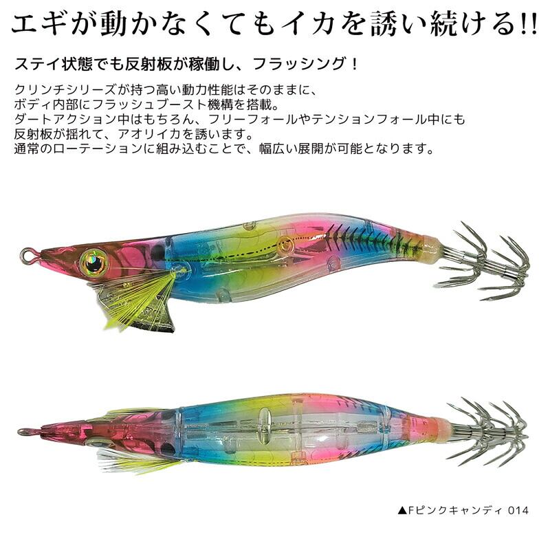 クリンチフラッシュブーストはフラッシングでイカに気付かせ、内部で動き続ける生命感のダブルアピールでしっかりと抱かせるためのエギです。