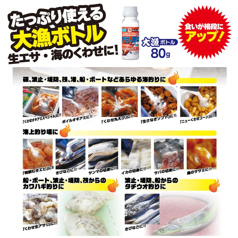 「アミノ酸α」同様に魚の大好物なアミノ酸と、フェロモン系特殊誘引剤『ウルトラバイト・アルファ』配合。摂餌効果が大幅に高まり、食いが格段にアップします。加工、生、ボイルなどのオキアミはもちろん、魚の切り身や、鳥のササミ、むきエビ、アサリ、コーン、さなぎなどあらゆる付けエサに使用可能。使い方は、簡単。適量を付けエサに振りかけ、絡めるように混ぜ合わせればOK。付けエサの量が多かったり、一度にたくさんの種類の付けエサに使用する場合など、大漁ボトルなら、キャップを開けてお好みの量をササッと使えるから超便利。「アミノ酸α」の威力で釣れるターゲットは無限大。磯、波止・堤防、筏や海上釣り堀、船、ボートなど、あらゆるジャンルで活躍する摂餌強化アイテムです。