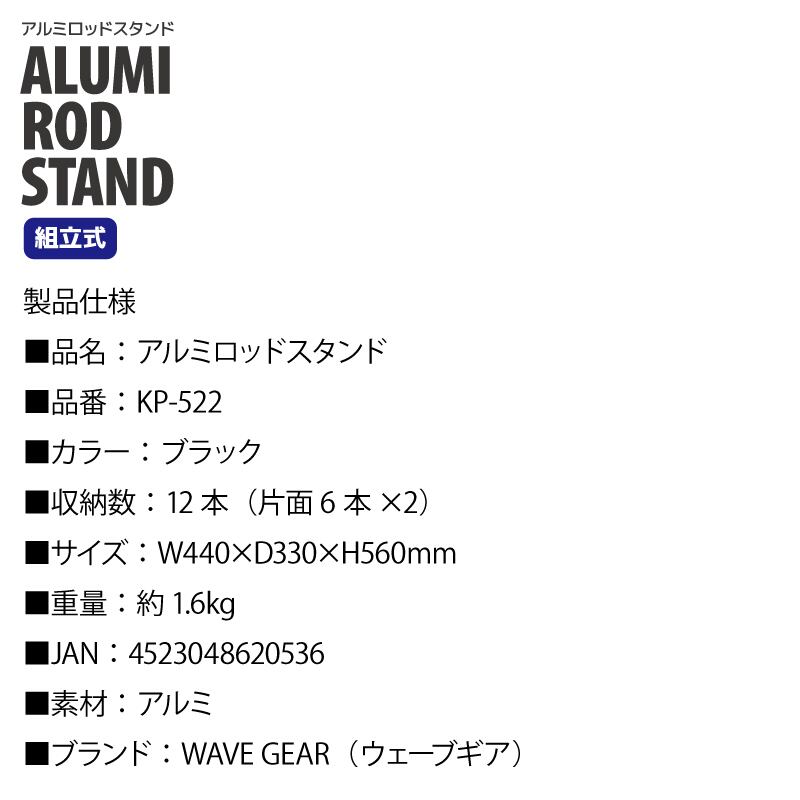 WAVE GEAR アルミロッドスタンド ブラック KP-522 組み立て式 W44×D33×H56cm 12本収納可能 竿立て 釣り
