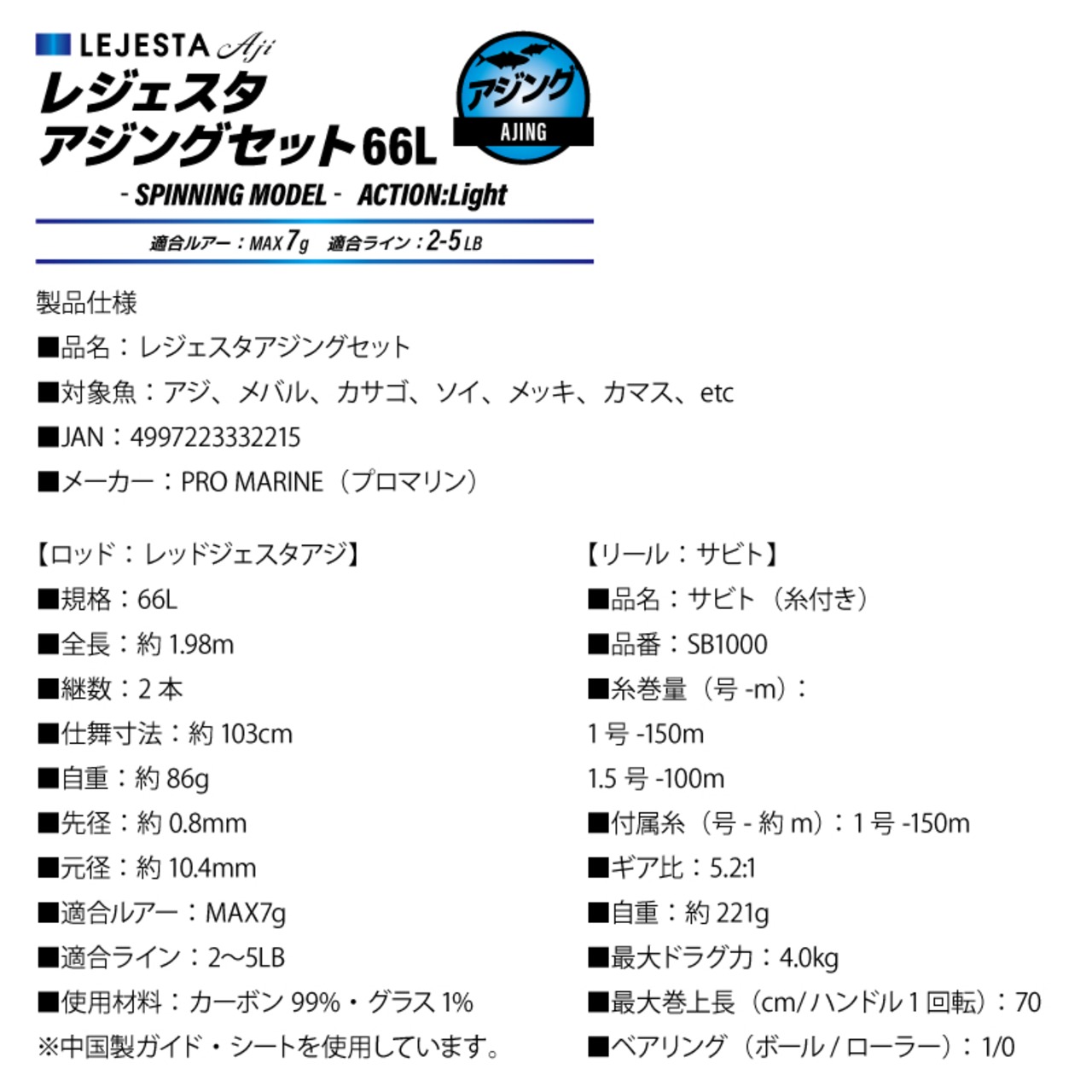 プロマリン ロッド+リールセット レジェスタアジングセット 66L 全長1.98m ルアーMAX7g ライン2-5LB スピニングモデル アジング用 釣り竿 アジ 釣り具 フィッシング