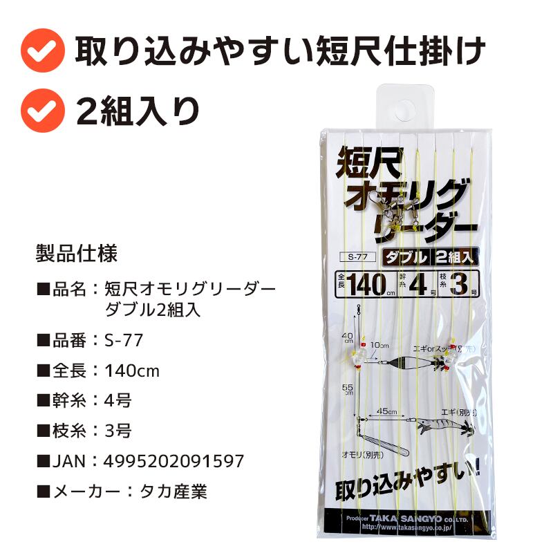 タカ産業 短尺オモリグリーダー ダブル2組入 S-77 全長140cm 幹糸4号 枝糸3号 仕掛け 釣具