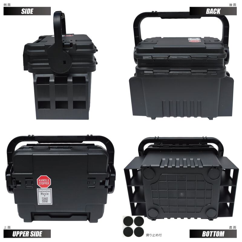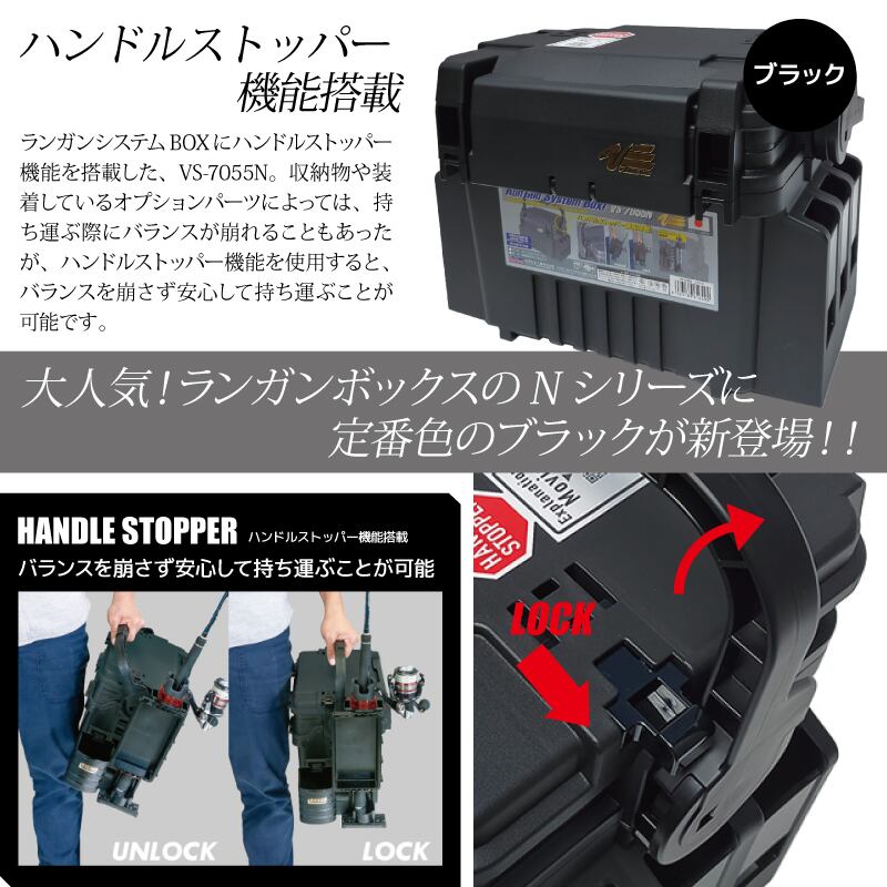 ランガンシステムBOXにハンドルストッパー機能を搭載した、VS-7055N。収納物や装着しているオプションパーツによっては、持ち運ぶ際にバランスが崩れることもあったが、ハンドルストッパー機能を使用すると、バランスを崩さず安心して持ち運ぶことが可能です。